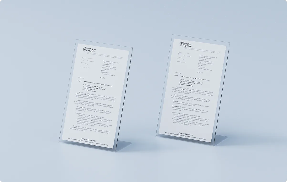 The first cerctificate in China, the fifth in the world. Successfully passed WHO Emergency Use Listing (EUL) approval for the Ustars’ Molecular POC Monkeypox Virus (MPXV ) Assay.